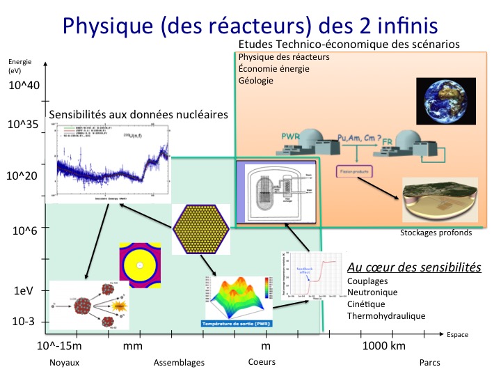Poser la question du réalisme des modélisations revient à interroger les hypothèses des simulations. Ces hypothèses peuvent être séparées schématiquement en deux catégories selon que l’échelle d’étude est plus petite ou plus grande que celle du réacteur, typiquement le mètre. D’une part, les simulations utilisent des données incertaines, dont on souhaite connaître l’impact sur les observables simulées nécessaires aux études de dimensionnement et de fonctionnement des réacteurs. D’autre part, puisqu’on ne connait pas le futur, les réacteurs qui pourraient être construits, la composition de leurs combustibles et les hypothèses qui feraient que les uns ou les autres pourraient être utilisés, sont indéterminées.